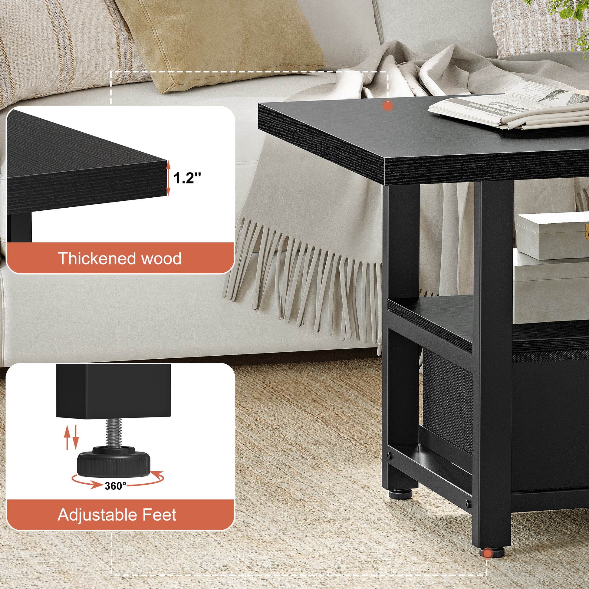 The stylish and farmhouse small wooden coffee table is here! Differ from traditional coffee tables, this small cocktail table top says goodbye to single color tone and features a color patchwork of dark brown and black to bring a unique taste to your living room! Open storage space and 2 foldable drawers with hidden fabric meet your different storage needs. The four legs constructed from a sleek steel frame are strong to support the table top and also create an industrial style atmosphere. This small square coffee table is the most affordable option for any living room! Bring it home soon!