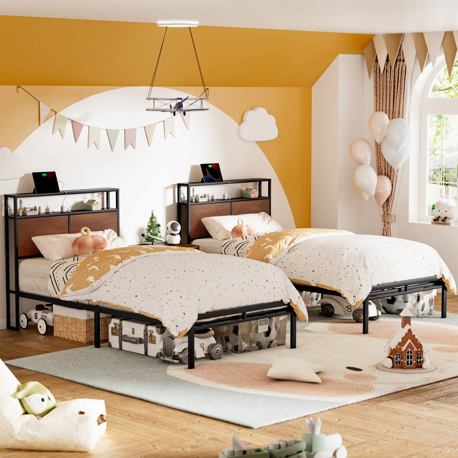 WOWLIVE Bed Frame with LED Light and Charging Station, Metal Frame with Storage Headboard, Large Storage Space, No Spring Box Needed