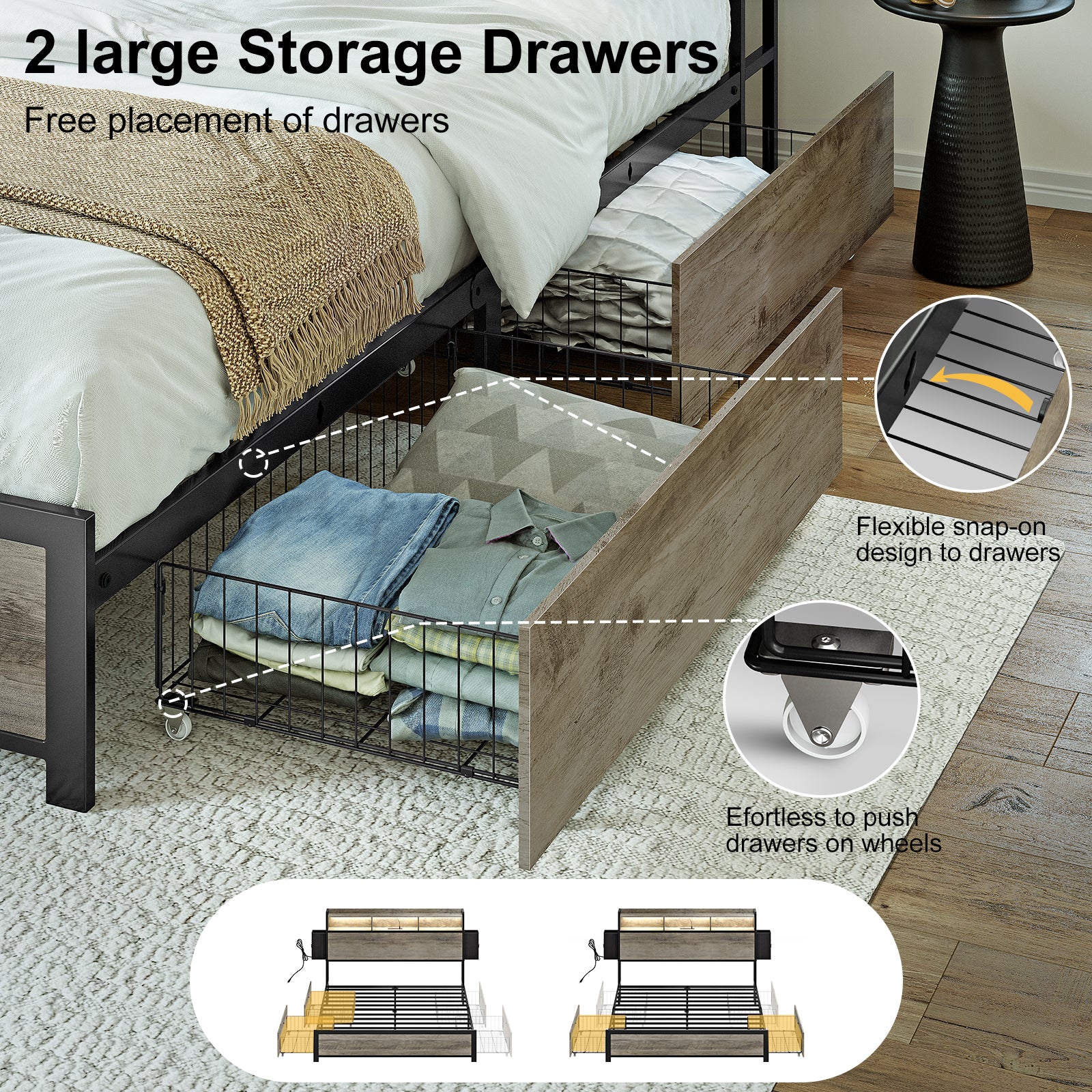 WOWLIVE Bed Frame with 2 Underbed Drawers & 2 Bedside Drawers, Modern Bed with Charging Station & LED Light