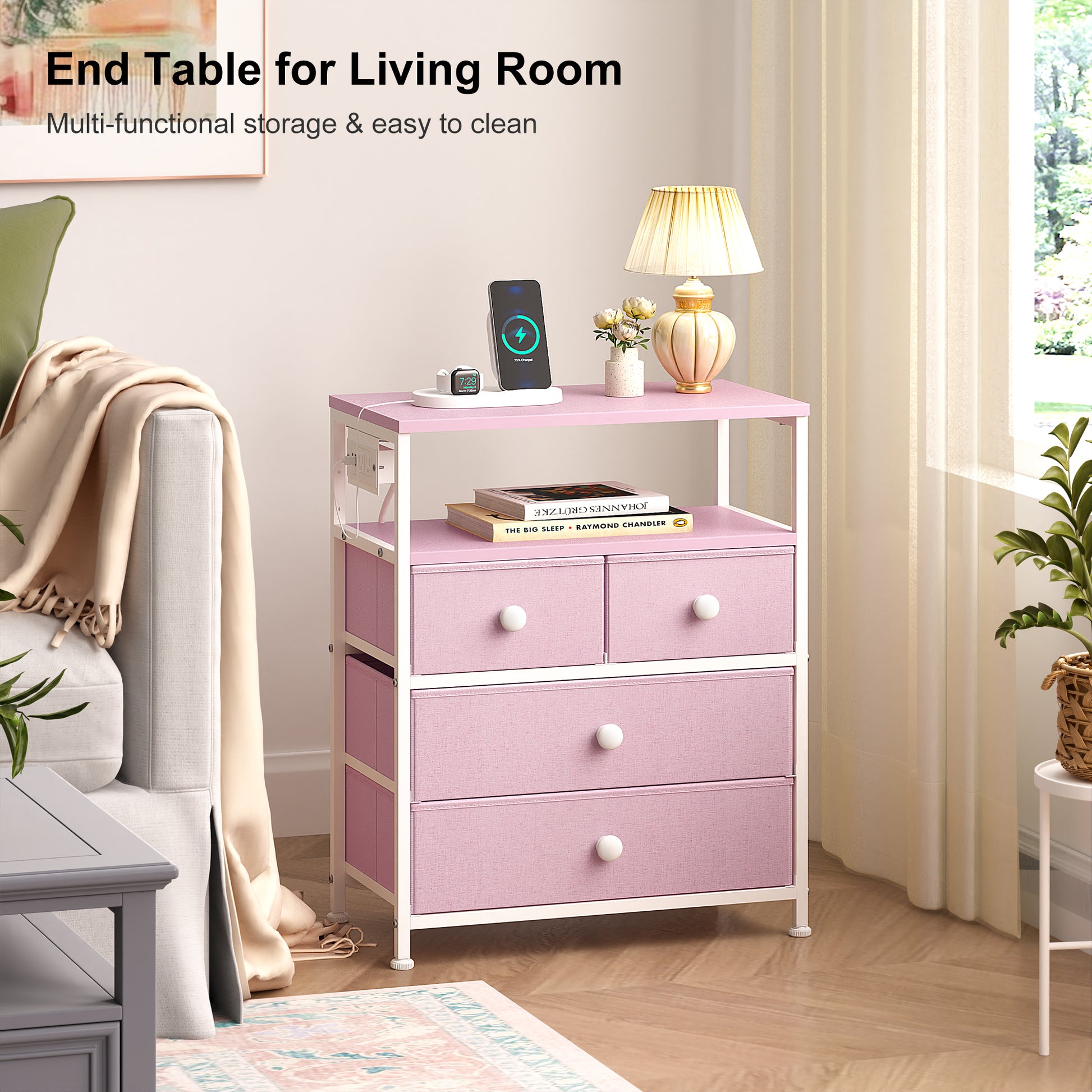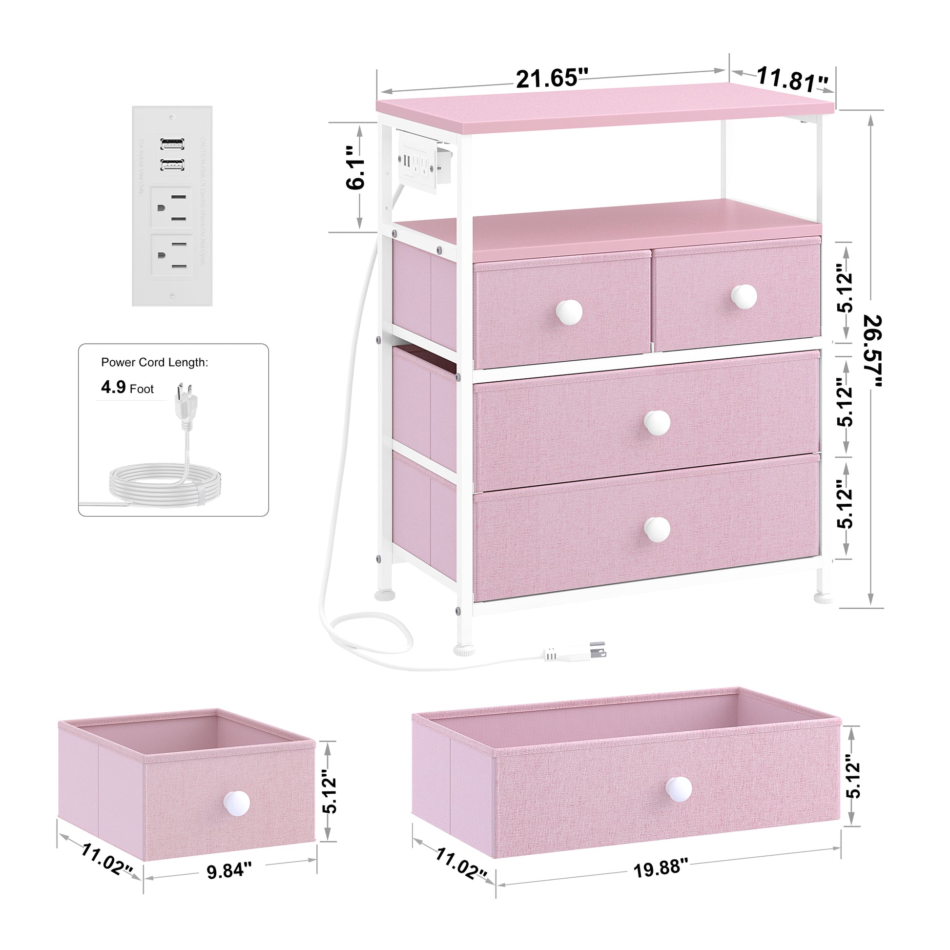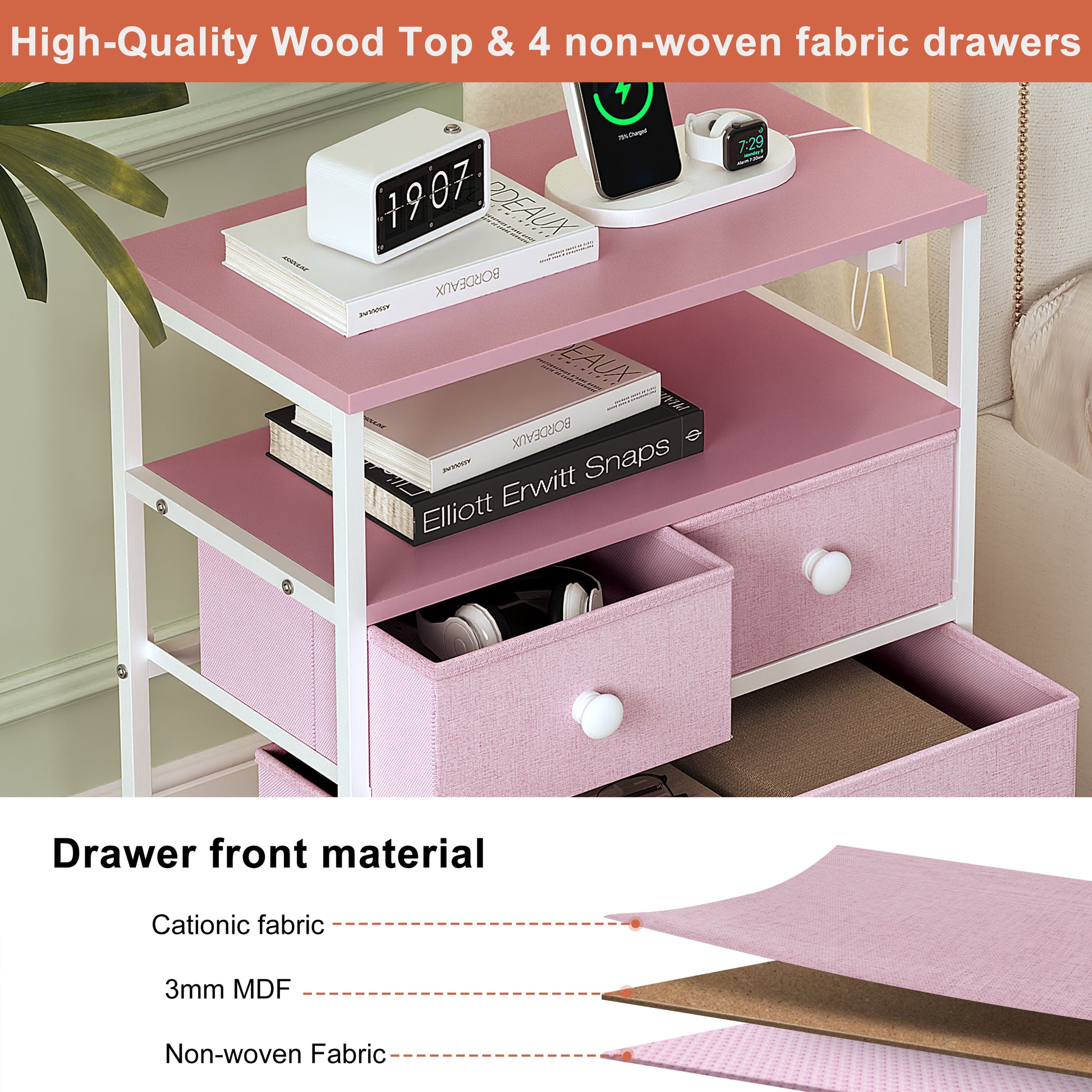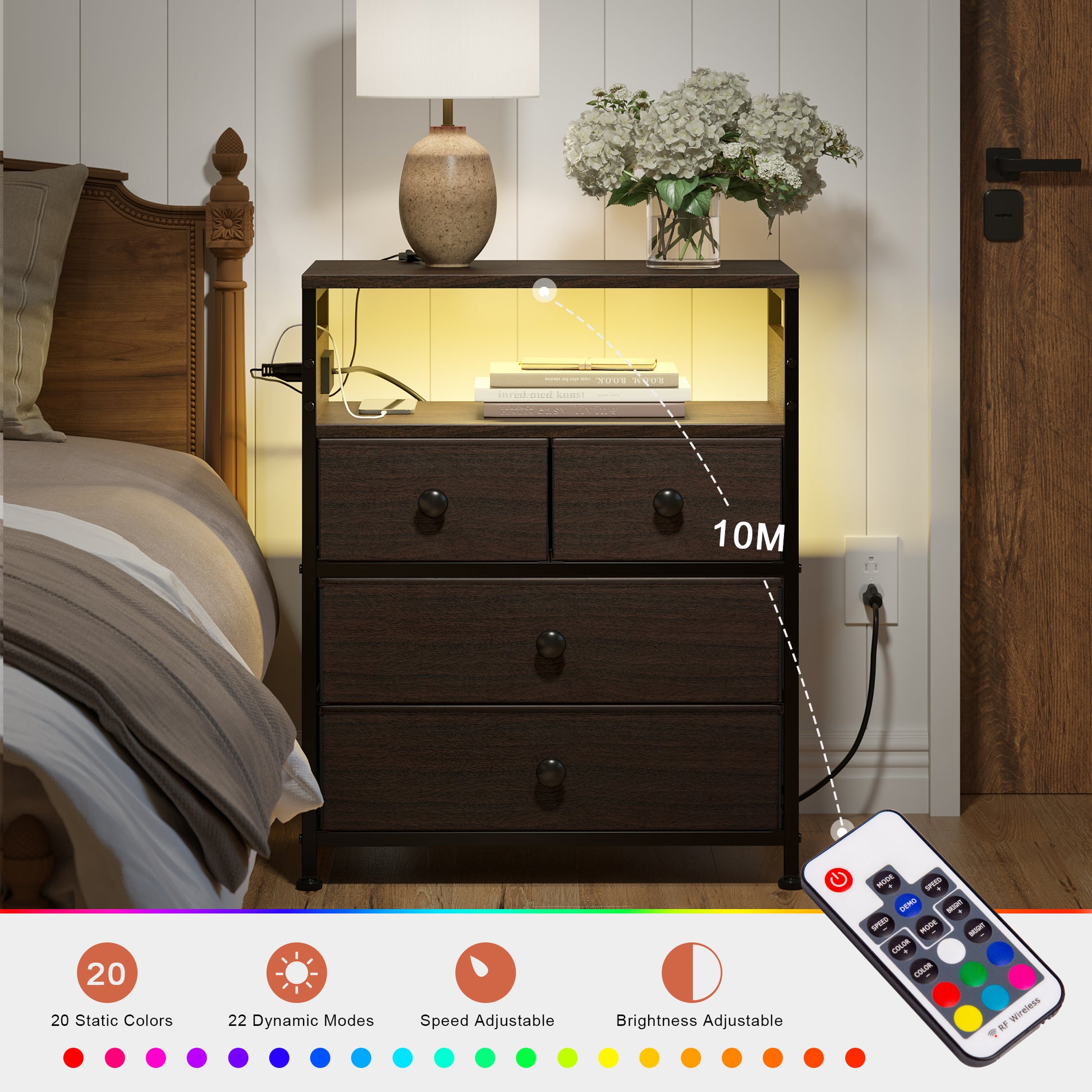 WOWLIVE Nightstand with 4 Drawers & Outlet, Bedside Table with LED Lights & 2-Tier wooden Shelf