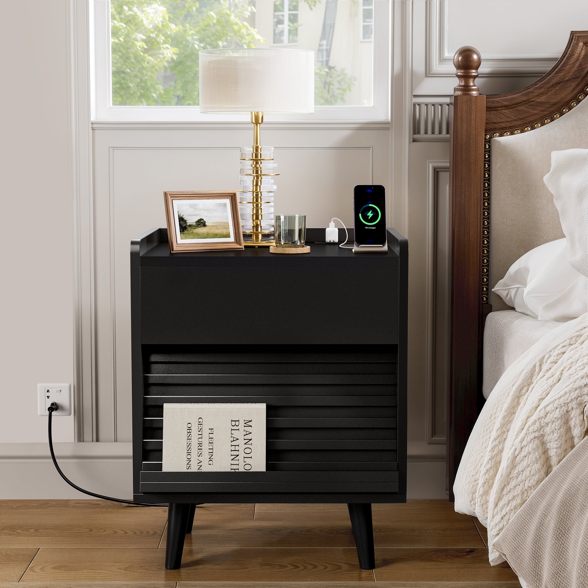 WOWLIVE Wooden Nightstand with 2 Drawers, Modern Bedside Table with Outlets & LED Lights, File Cabinet